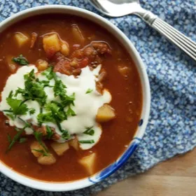 Cremet gullashsuppe - opskrift på god hjemmelavet gullash suppe med oksebov, bacon og gulerødder