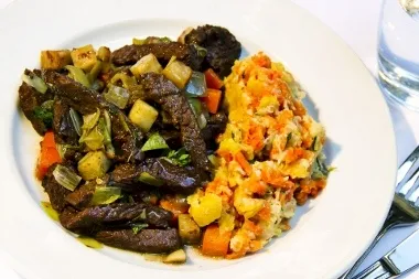 Varmende simremad med mos af rodfrugter med smagfuld ungkvægkød i, skrællet pastinak og mellemstor