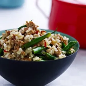Hjemmelavet thaikrydret svinekød med jasminris, økologisk hakket svinekød og hvidløg
